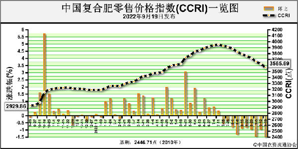 9月19日中國(guó)復(fù)合肥零售價(jià)格指數(shù)(CCRI)為3565.69點(diǎn),環(huán)比下跌63.77點(diǎn),跌幅為1.76%;同比上漲635.83點(diǎn),漲幅為21.70%;比基期上漲1118.98點(diǎn),漲幅為45.73%。