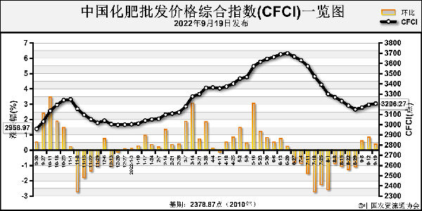 9月19日中國(guó)化肥批發(fā)價(jià)格綜合指數(shù)(CFCI)為3206.27點(diǎn),環(huán)比上漲11.86點(diǎn),漲幅為0.37%;同比上漲247.30點(diǎn),漲幅為8.36%;比基期上漲827.43點(diǎn),漲幅為34.78%。